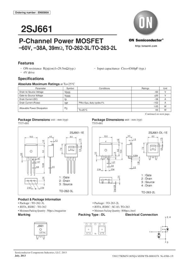 P-Channel Power MOSFET, -60V, -38A, 39mOhm, TO-262-3L/TO-263-2L