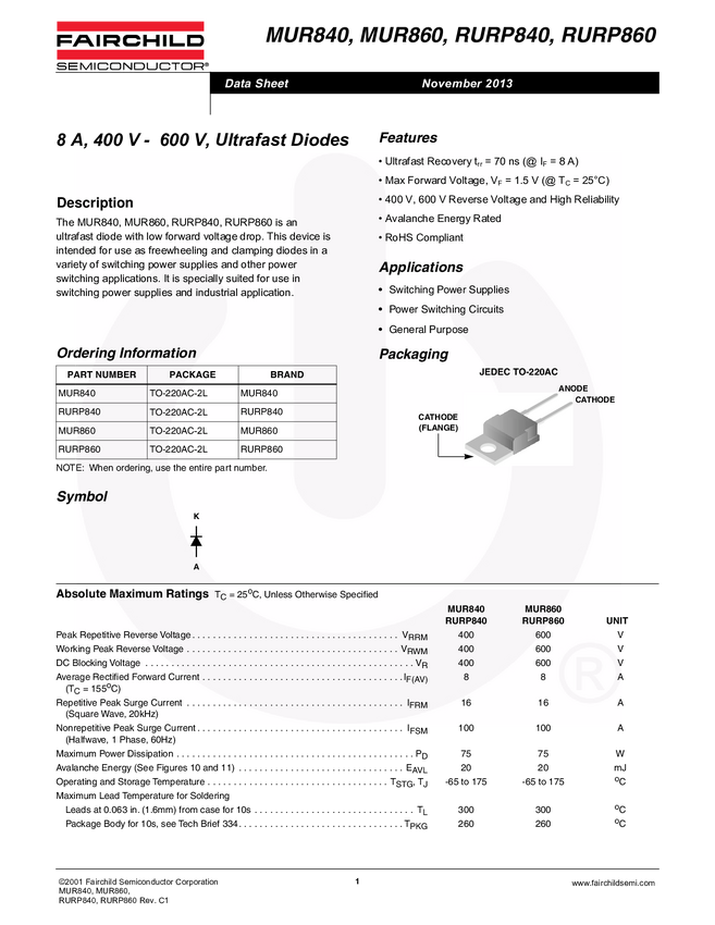Dioda; MUR860; prostownicza; 8A; 600V; 50ns; 1,14-1,39mm; TO220-2; THT; YANGJIE TECHNOLLOGY; RoHS