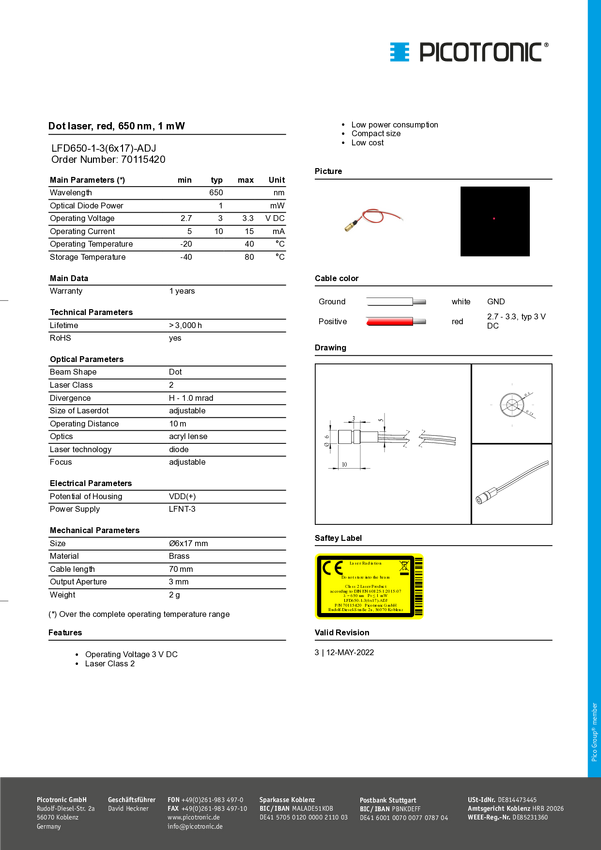 Moduł laserowy; 1mW; czerwony; punkt; 650nm; 2,7...3,3V DC; 5...15mA; fi 6x17mm; przewody; dioda laserowa; 70115420 / LFD650-1-3ADJ-6X17; PICOTRONIC; RoHS