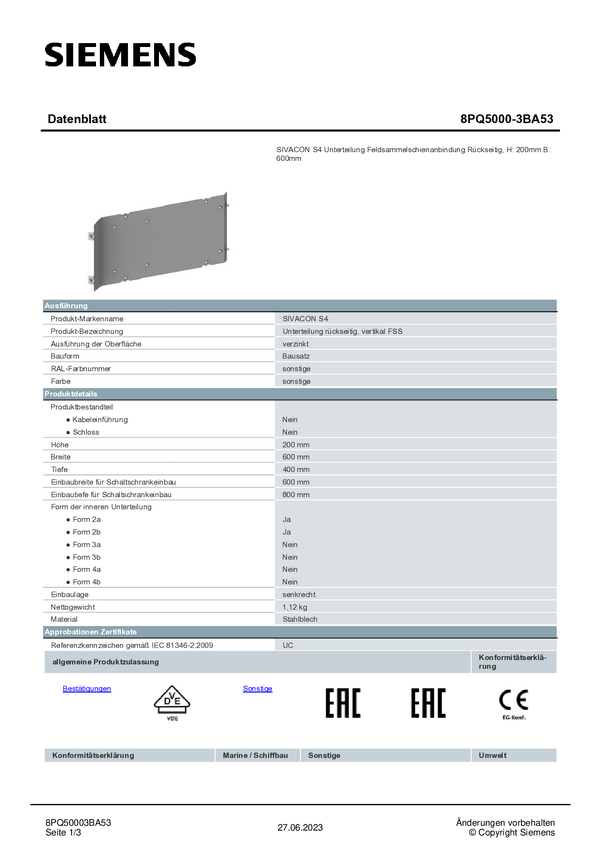 Pooddział Siemens 8PQ5000-3BA53 1 szt.