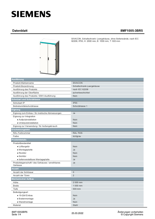Szafka instalacyjna Siemens 8MF1005-3BR5, 1000 x 2000 x 500, stal, 1 szt.