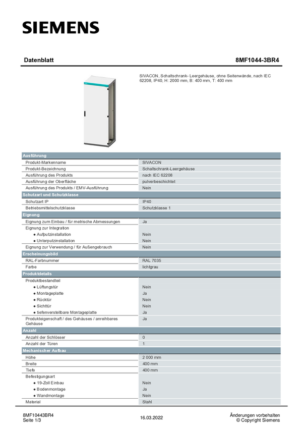 Szafka instalacyjna Siemens 8MF1044-3BR4, 400 x 2000 x 400, stal, 1 szt.