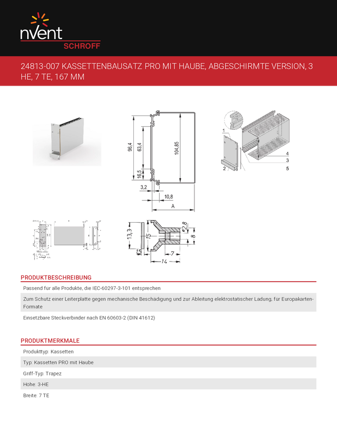 Kasety SCHROFF PRO z kapturem, 3 HE, panel przedni ekranowany (uszczelka tekstylna) - KAS M.HAUBE EMV 3HE 7TE 167T