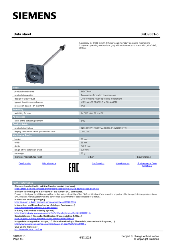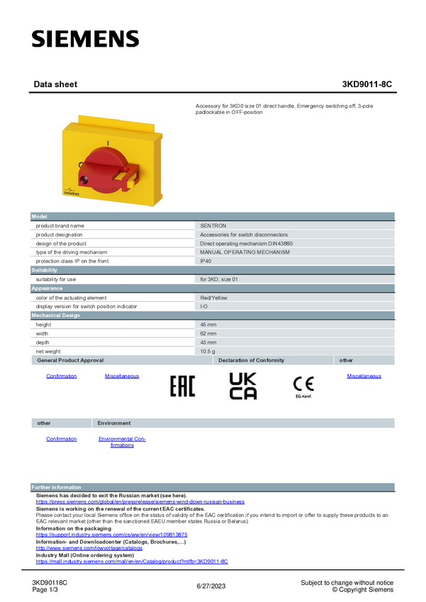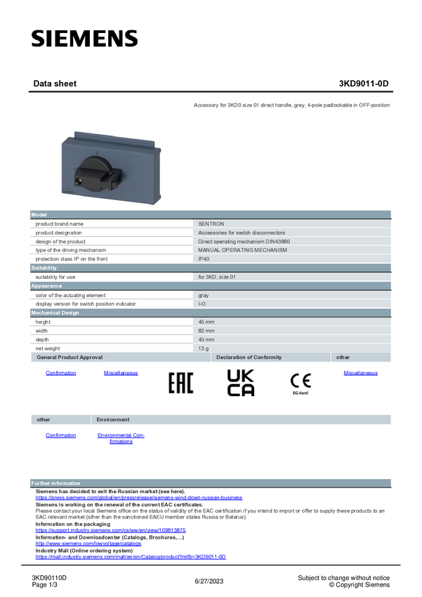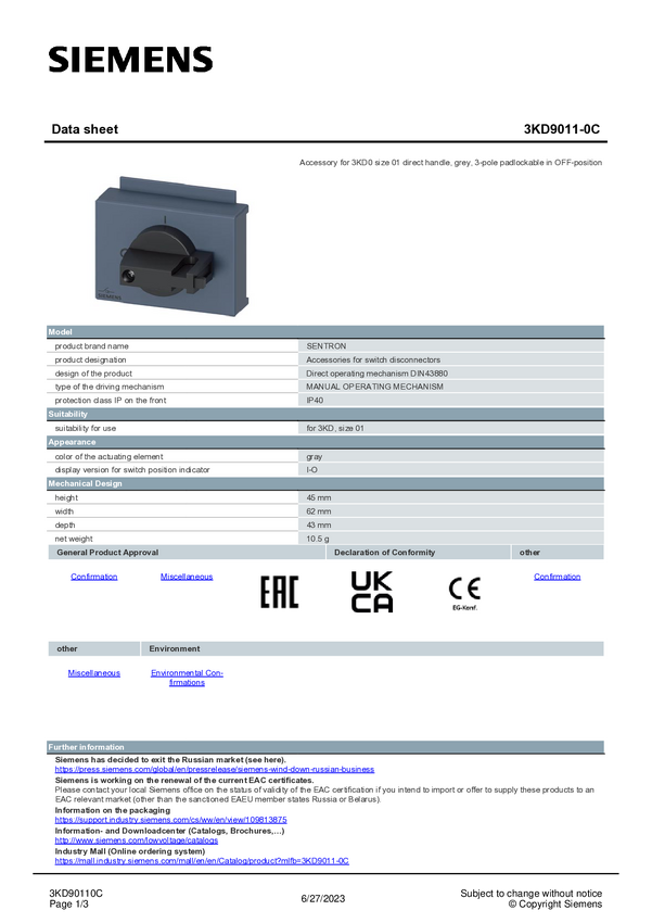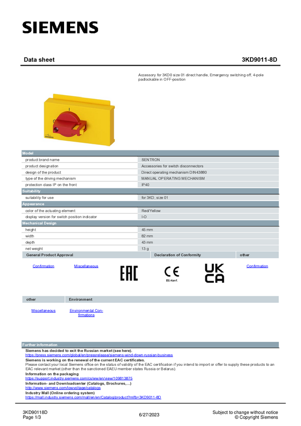 Mechanizm operacyjny do stałego montażu Siemens 3KD9011-0D 1 szt.