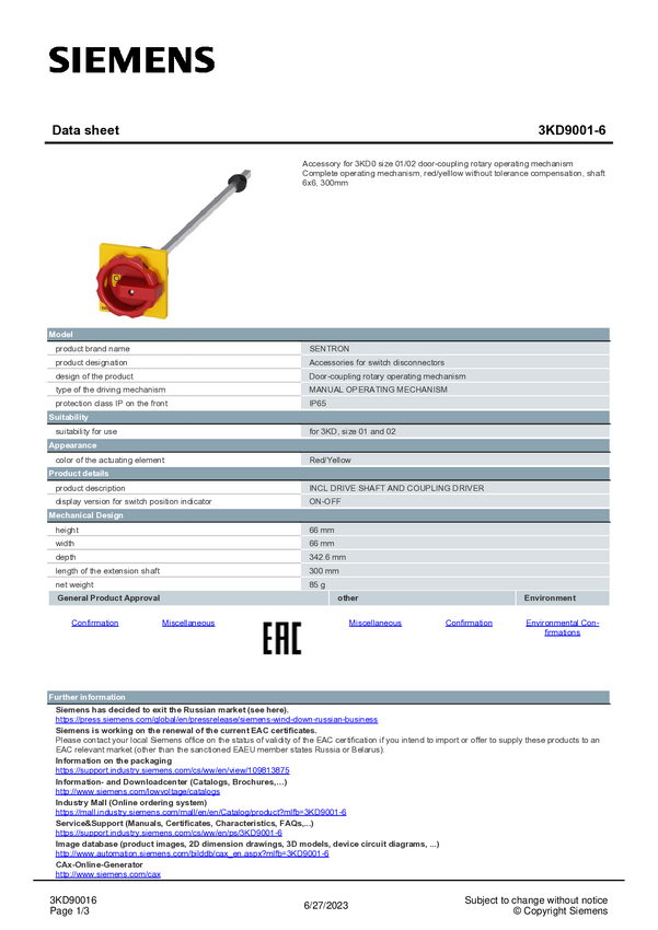 Mechanizm operacyjny do stałego montażu Siemens 3KD9001-6 1 szt.