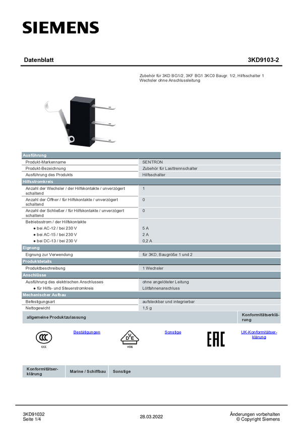 Przełącznik pomocniczy Siemens 3KD9103-2 3KD91032, 1 szt.