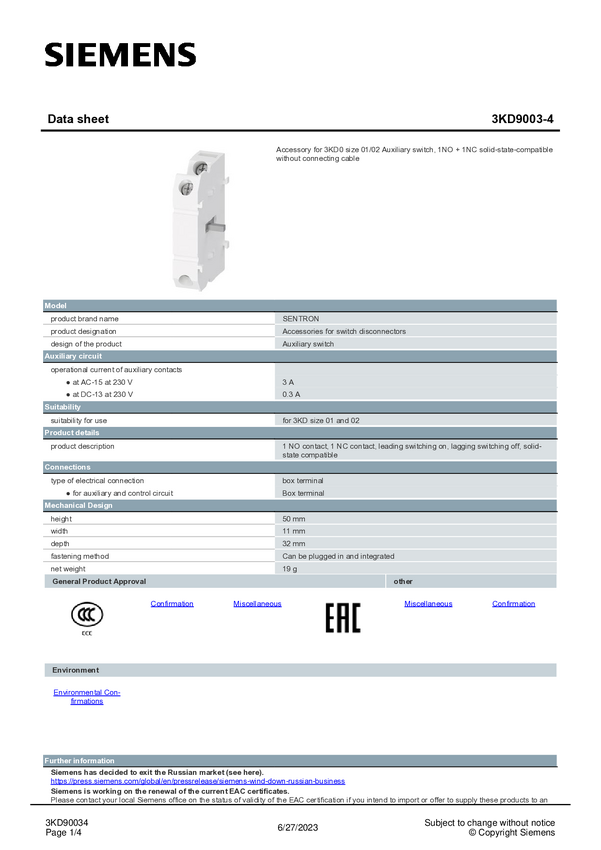 Siemens 3KD9003-4 Przełącznik pomocniczy 1 szt.
