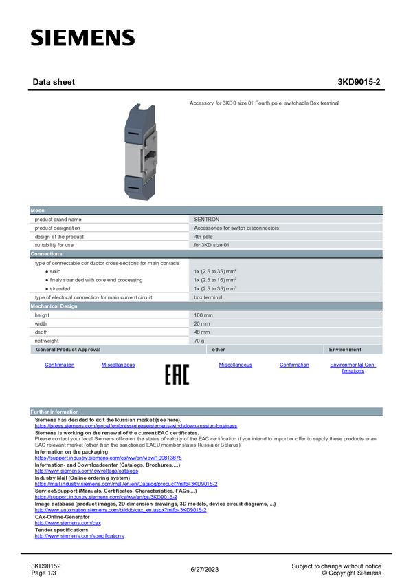 Pokrywa zacisków Siemens 3KD9025-2 1 szt.