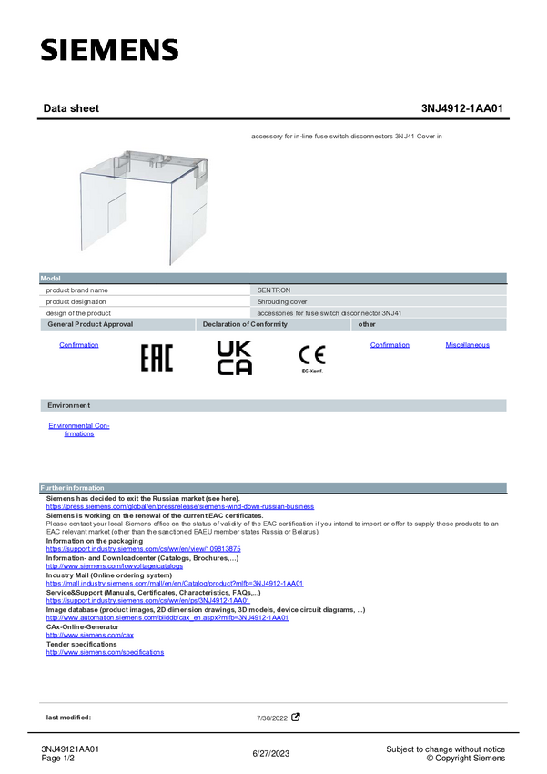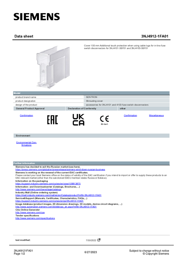Zestaw akcesoriów Siemens 3NJ4912-3CA00 1 szt.
