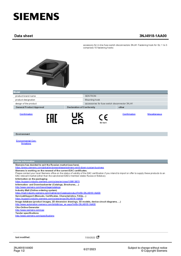Zestaw akcesoriów Siemens 3NJ4918-1AA00 1 szt.