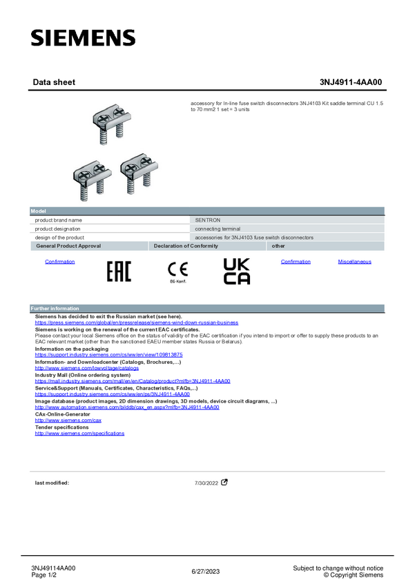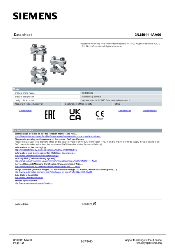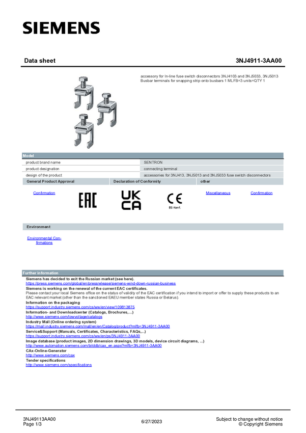 Zestaw akcesoriów Siemens 3NJ4911-6CA00 1 szt.
