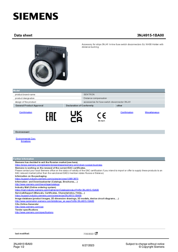 Zestaw akcesoriów Siemens 3NJ4915-1BA00 1 szt.