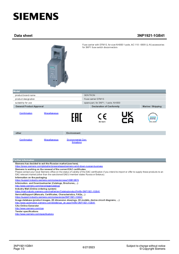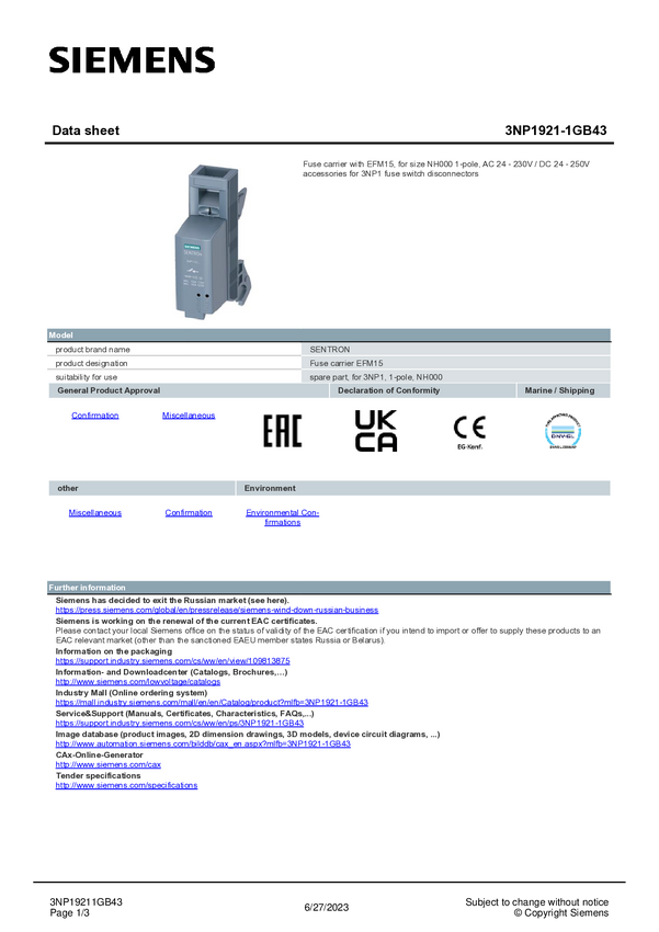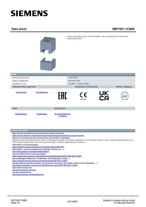 Złącze instalacyjne Siemens 3NP1921-1BD00 1 szt.