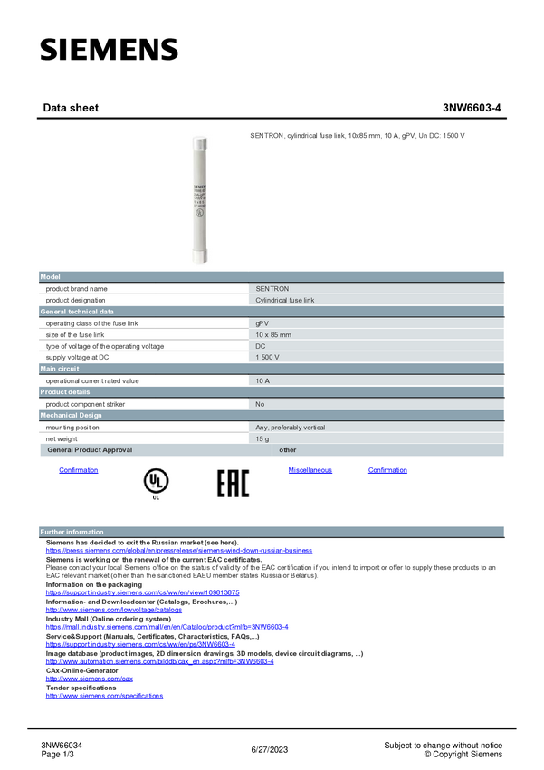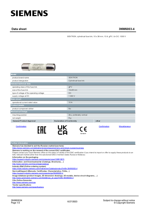 Siemens 3NW66034 Wkładka bezpiecznika cylindrycznego 10 szt.