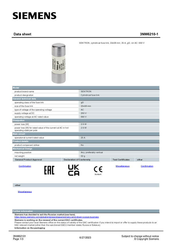 Siemens 3NW62101 Wkładka bezpiecznika cylindrycznego 10 szt.
