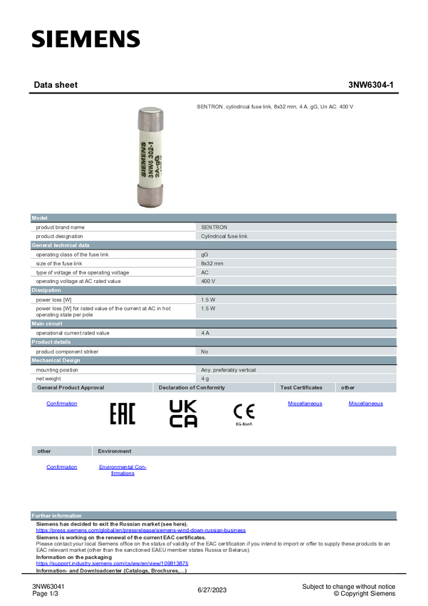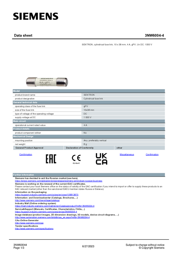 Siemens 3NW63041 Wkładka bezpiecznika cylindrycznego 10 szt.