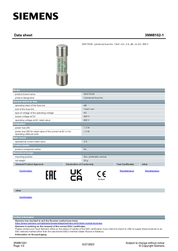 Siemens 3NW81021 Wkładka bezpiecznika cylindrycznego 10 szt.