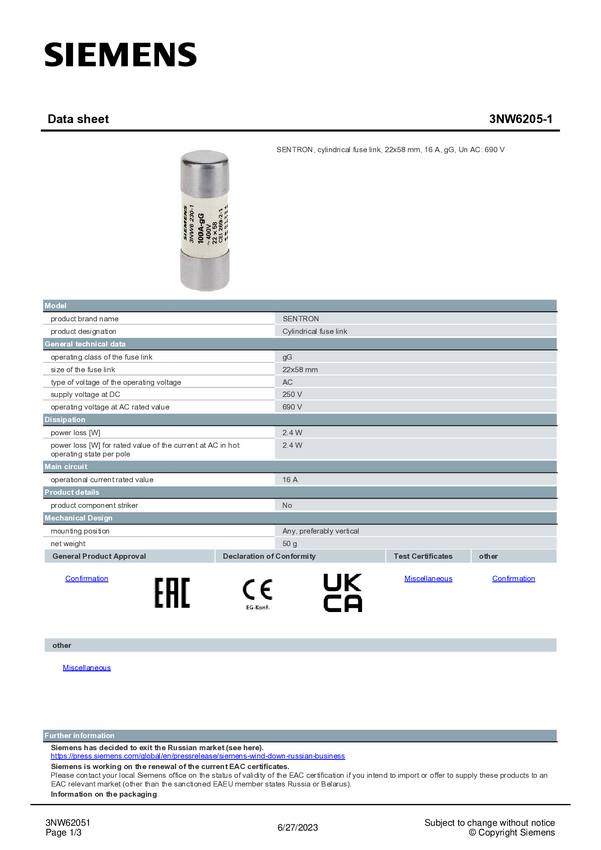 Siemens 3NW62051 Wkładka bezpiecznika cylindrycznego 10 szt.