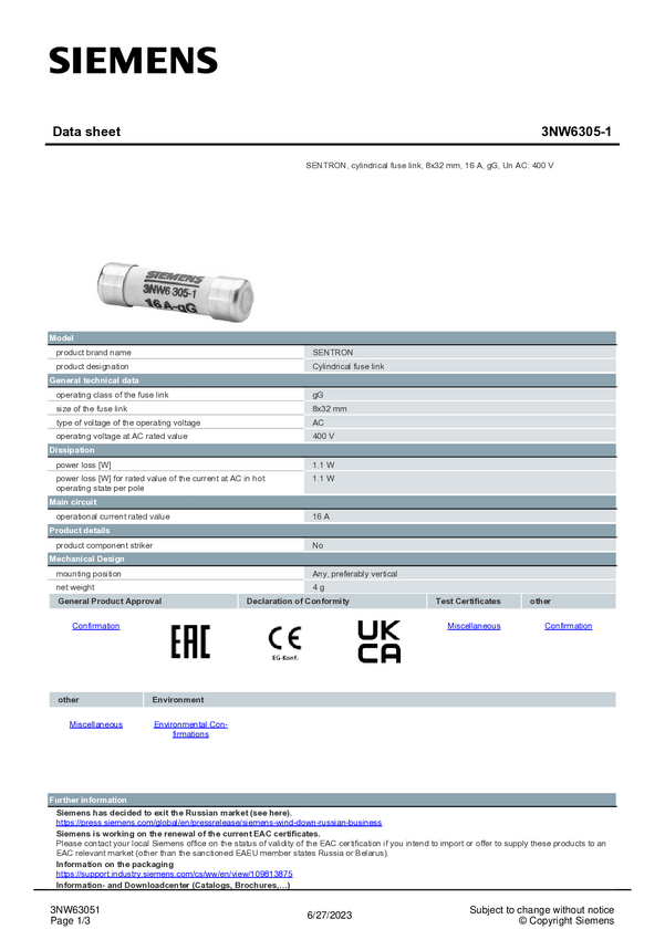 Siemens 3NW63071 Wkładka bezpiecznika cylindrycznego 10 szt.