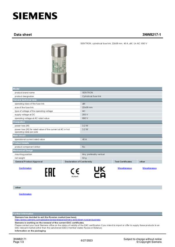 Siemens 3NW82171 Wkładka bezpiecznika cylindrycznego 10 szt.