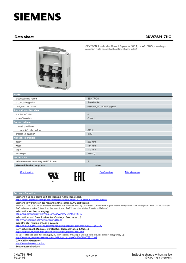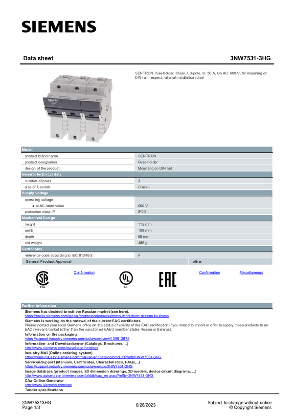 Siemens 3NW75318HG Uchwyt bezpiecznika 1 szt.