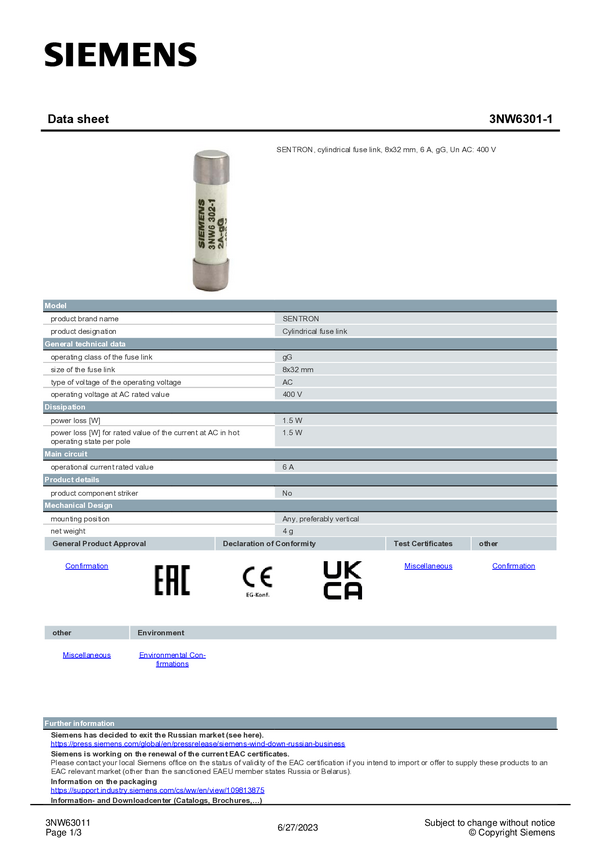 Siemens 3NW63011 Wkładka bezpiecznika cylindrycznego 10 szt.