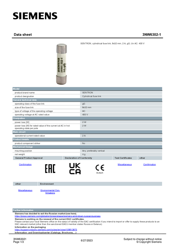 Siemens 3NW63021 Wkładka bezpiecznika cylindrycznego 10 szt.