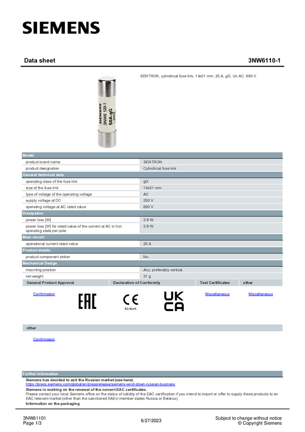 Siemens 3NW61101 Wkładka bezpiecznika cylindrycznego 10 szt.