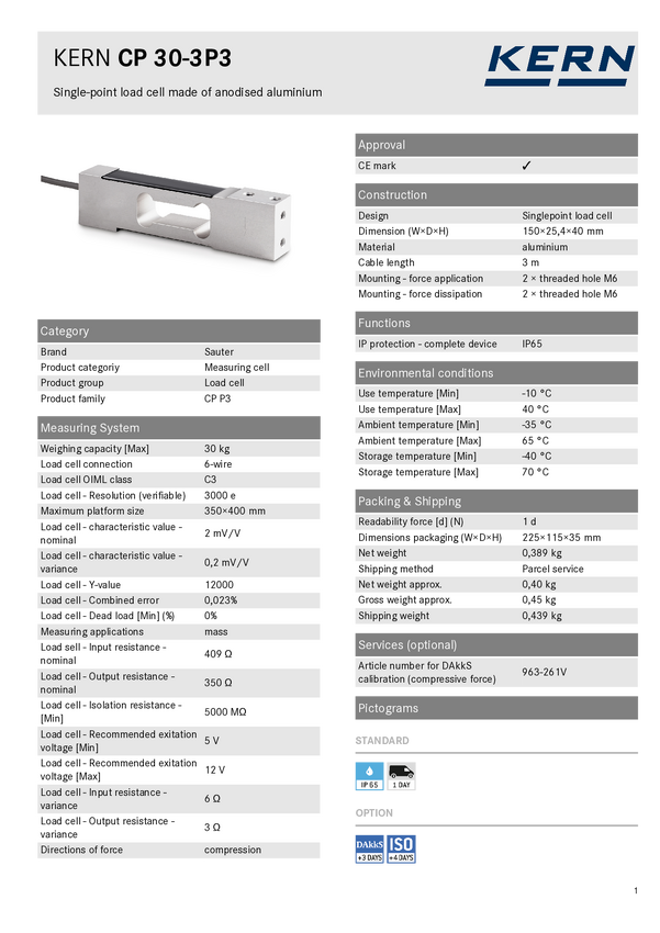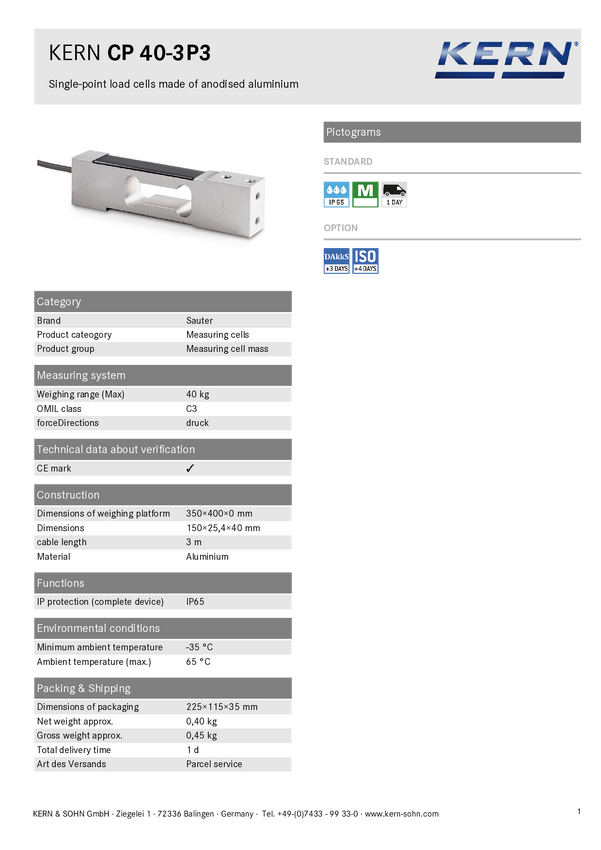 Ogniwo obciążnikowe CP 40-3P3, klasa OIML C3, nośność 40 kg Kern CP 40-3P3