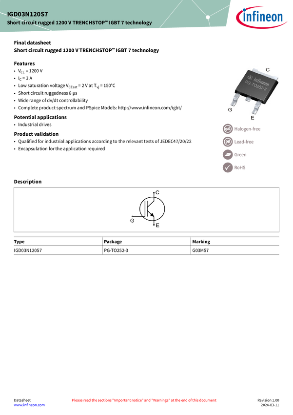 1200 V, 3 A IGBT7 S7 in TO-252-3pin package Hard-switching 1200 V, 3 A single TRENCHSTOP™ IGBT7 S7 discrete in TO-252 package which offers low VCEsat to achieve very low conduction losses in target applications.