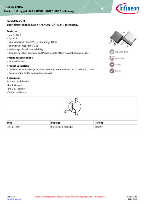 1200 V, 15 A IGBT7 S7 in TO-263-3pin package Hard-switching 1200 V, 15 A single TRENCHSTOP™ IGBT7 S7 discrete in TO-263 package which offers low VCEsat to achieve very low conduction losses in target applications.