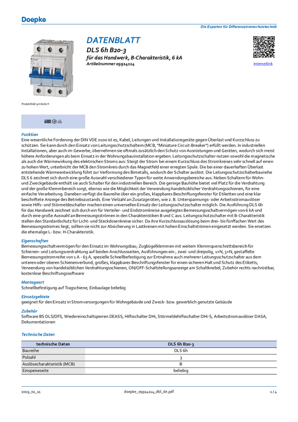 Wyłącznik automatyczny Doepke DLS6H B20A 3polig 6KA 09914114, 3 styki, 230 V, 400 V, 20 A