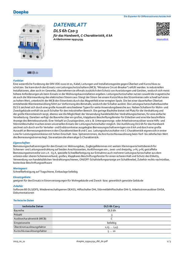 Wyłącznik automatyczny Doepke DLS6H C20A 3polig 6KA 09914294, 3 styki, 230 V, 400 V, 20 A