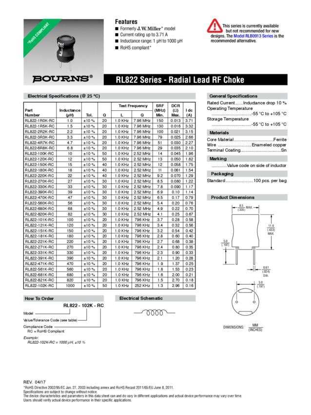 Ind RF Choke 3.3uH 10% 1KHz 20Q-Factor Ferrite 2.66A RDL Bag