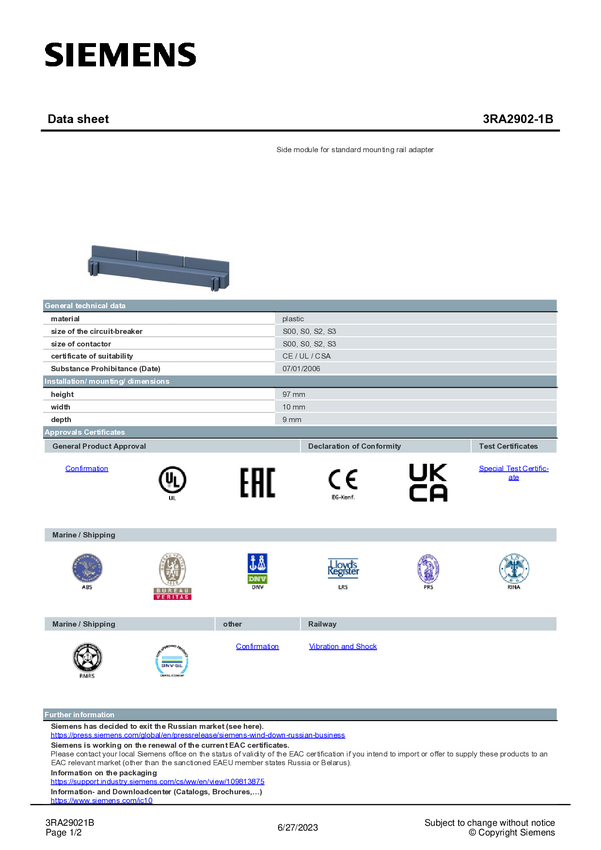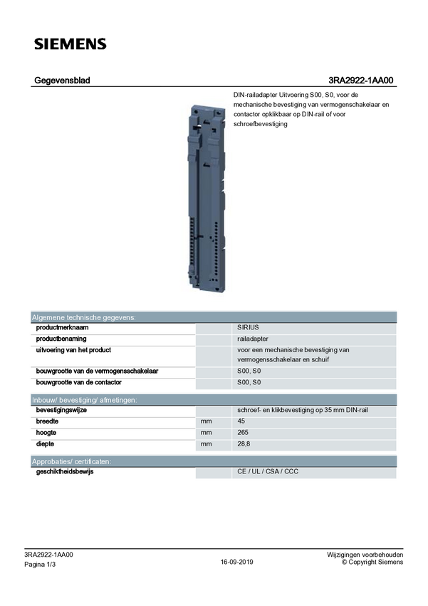 Adapter na szynę DIN Siemens 3RA2922-1AA00 1 szt.