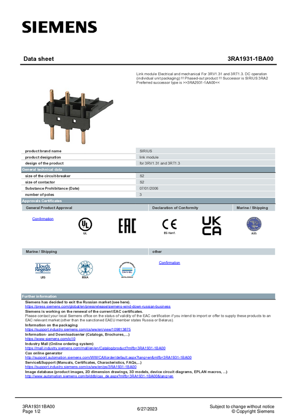 Siemens 3RA1931-1BA00 Moduł łączący 1 szt.