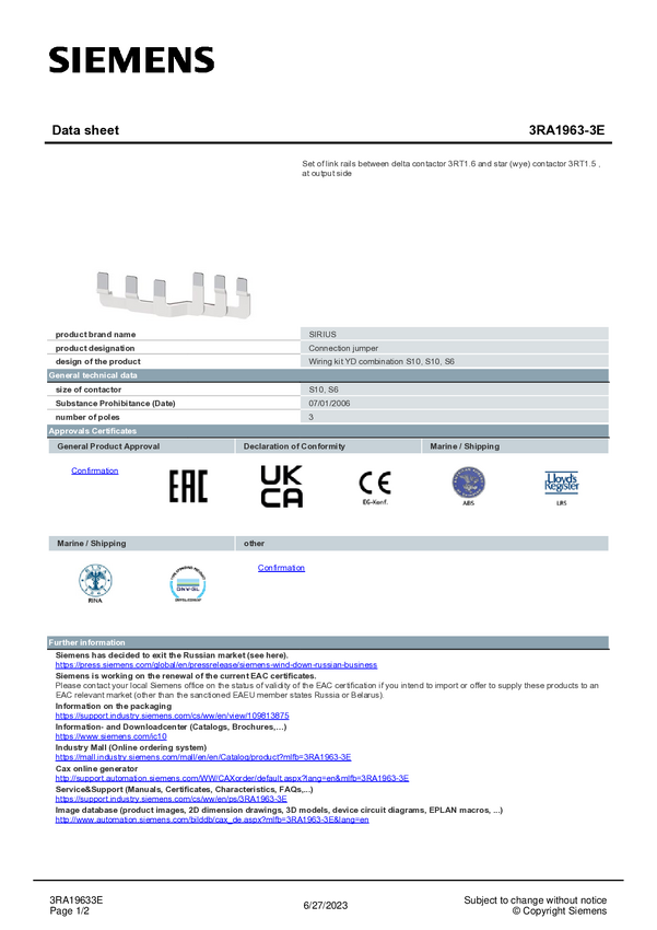Łącznik Siemens 3RA1963-3E 3RA19633E, 1 szt.