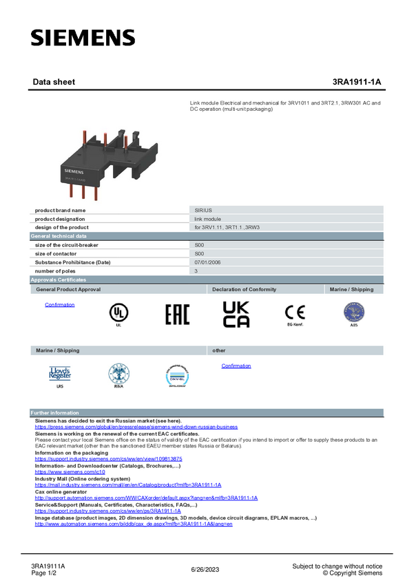 Siemens 3RA1911-1AA00 Moduł łączący 1 szt.