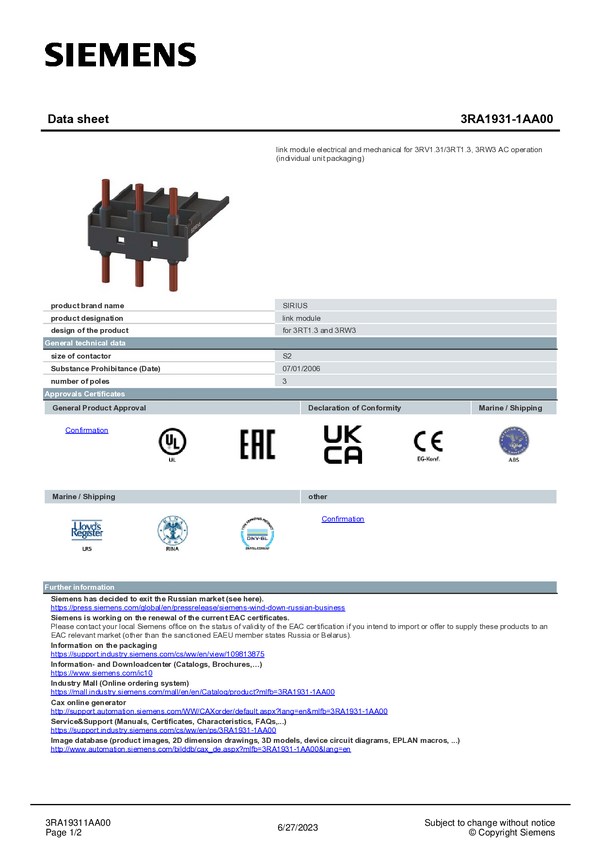 Moduł łączący Siemens 3RA1941-1AA00 3RA19411AA00, 1 szt.