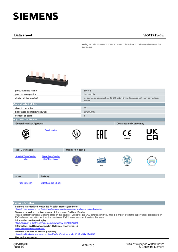 Siemens 3RA1943-3E Moduł okablowania 1 szt.