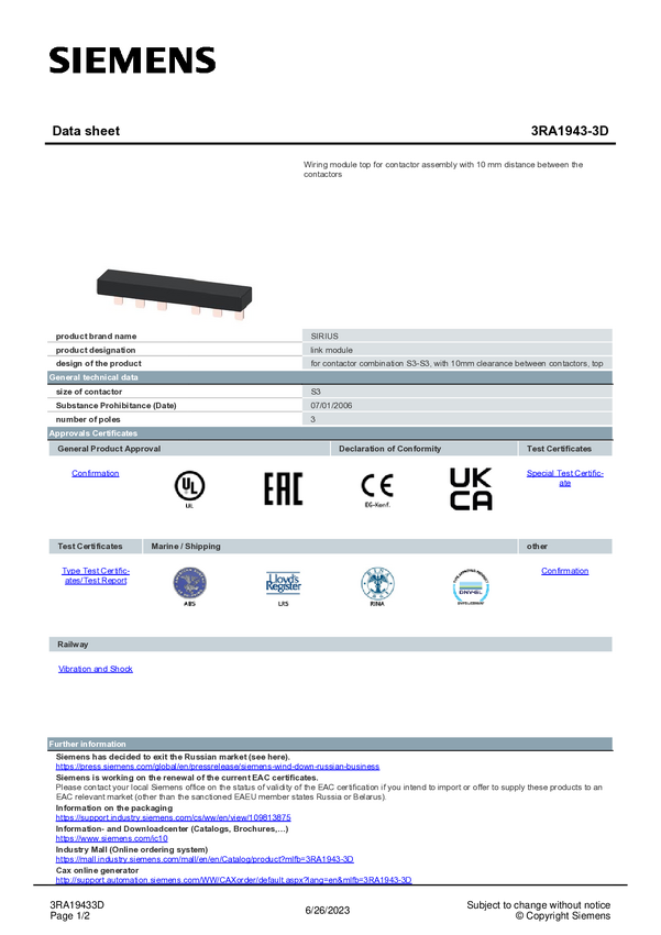 Moduł okablowania Siemens 3RA1933-3D 3RA19333D, 1 szt.