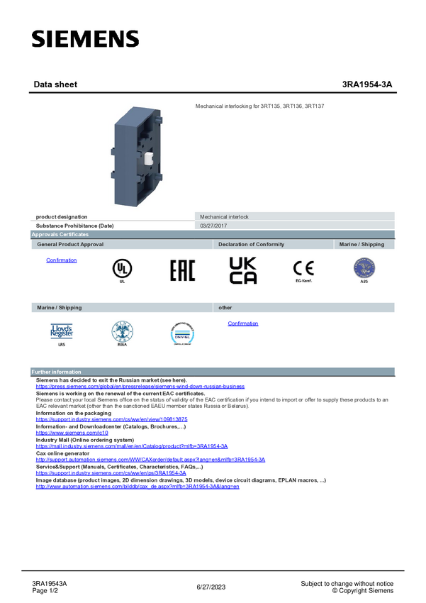 Blokada Siemens 3RA1954-3A 3RA19543A, 1 szt.