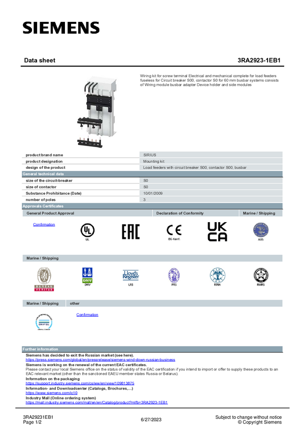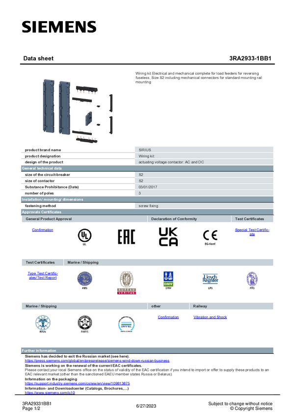 Siemens 3RA2933-1BB1 Zestaw podłączeniowy 1 szt.