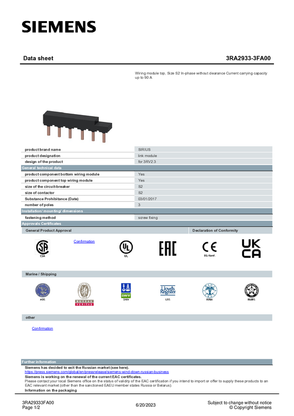 Zestaw podłączeniowy Siemens 3RA2933-3FA00 3RA29333FA00, 1 szt.