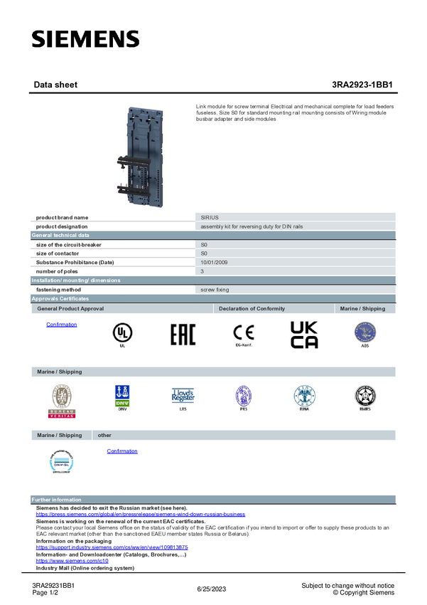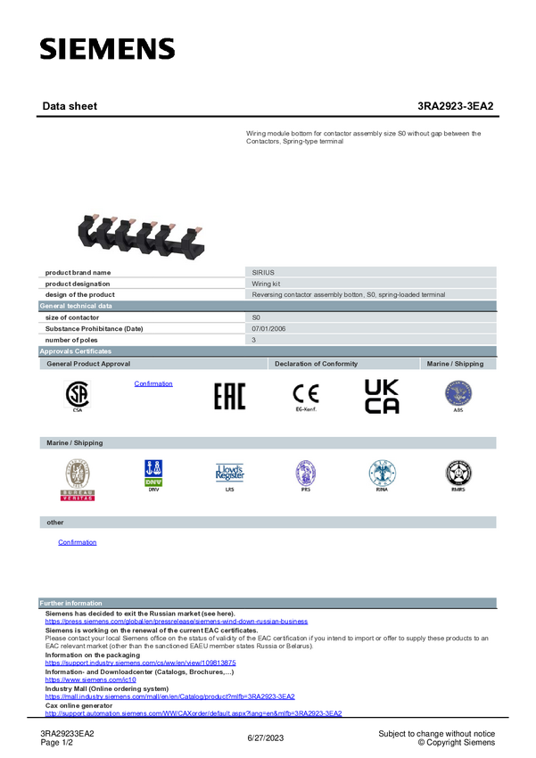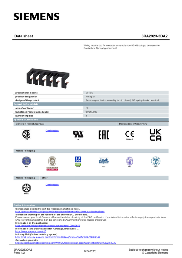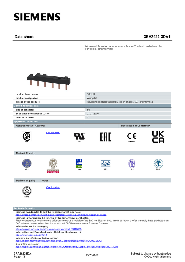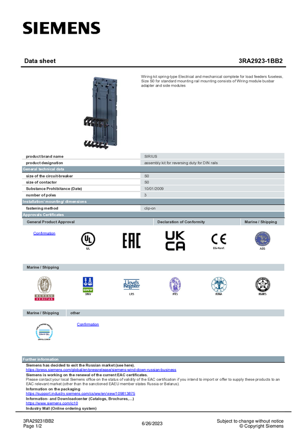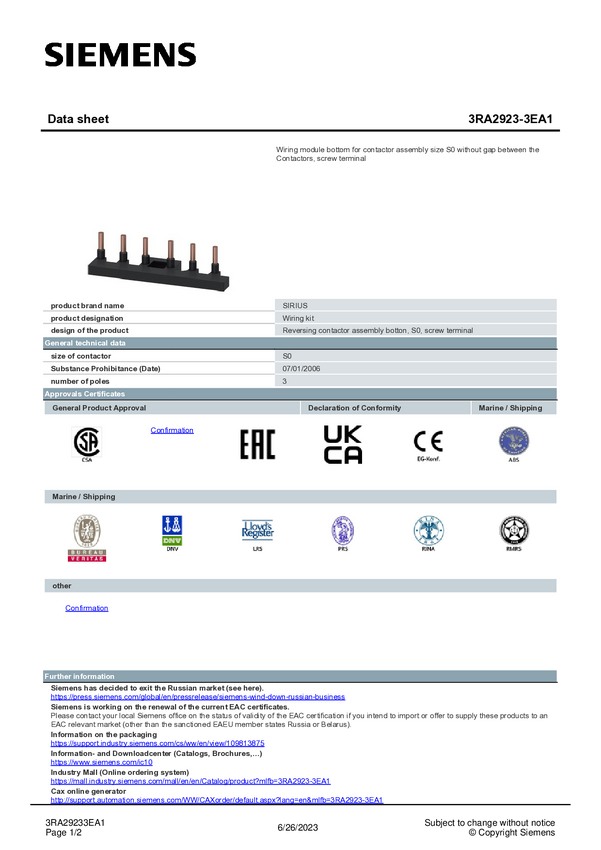 Siemens 3RA2923-1BB2 Zestaw podłączeniowy 1 szt.