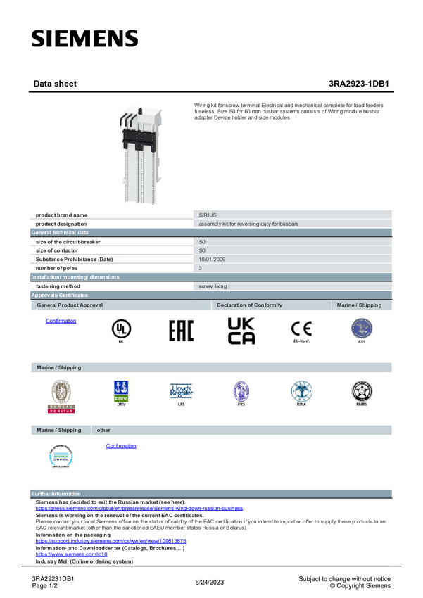 Siemens 3RA2923-1DB1 Zestaw podłączeniowy 1 szt.