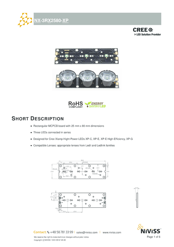 Moduł , jasność 3 x R2-114 lm/350 mA , - barwa 1B (ok.6500-7100K), wymiar 25mm x 80mm