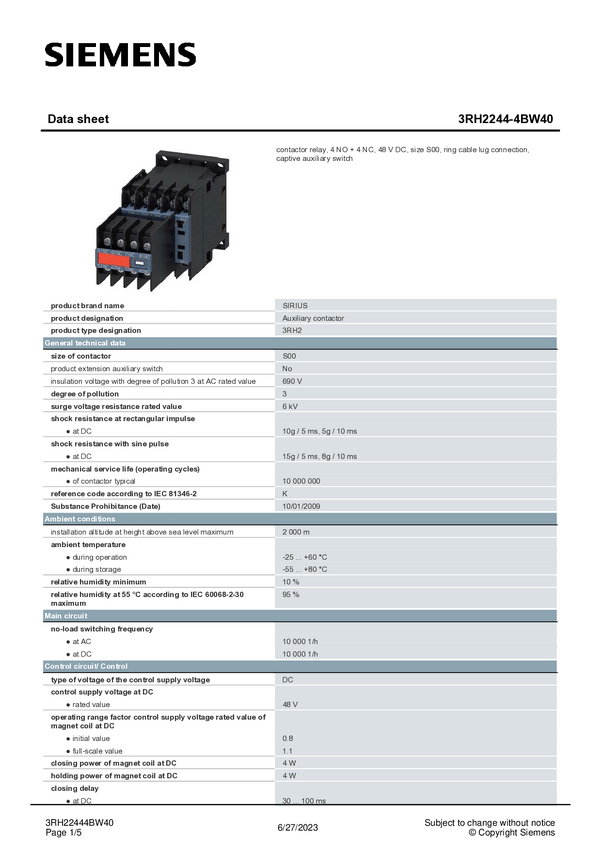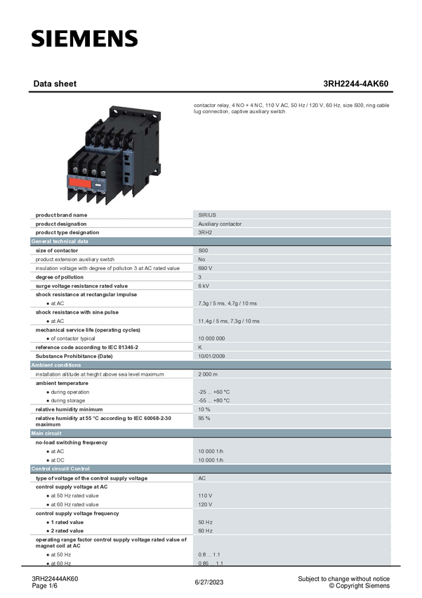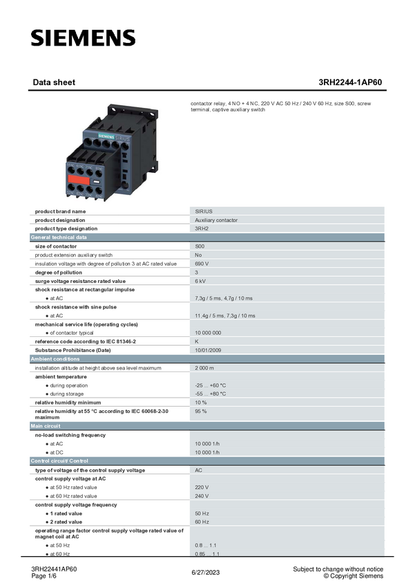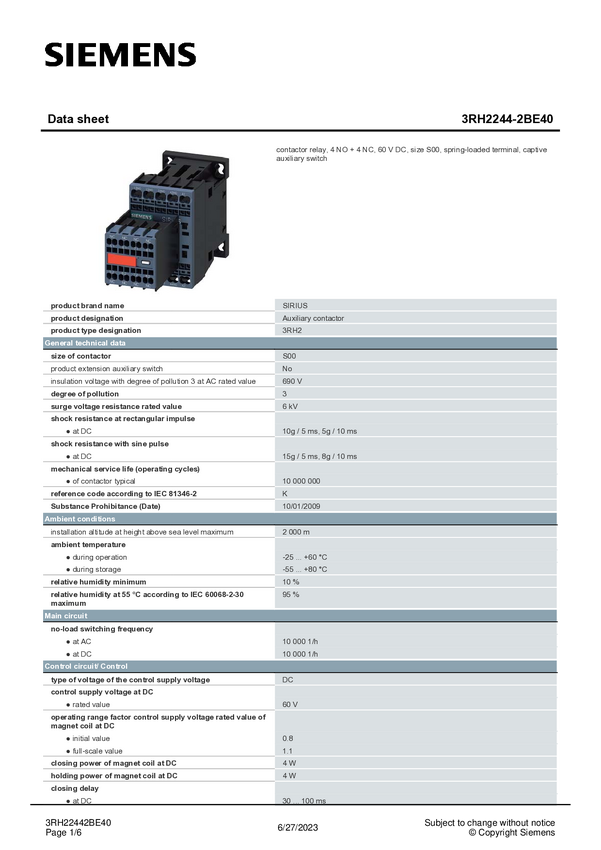 Siemens 3RH2244-4AK60 Stycznik pomocniczy 1 szt.