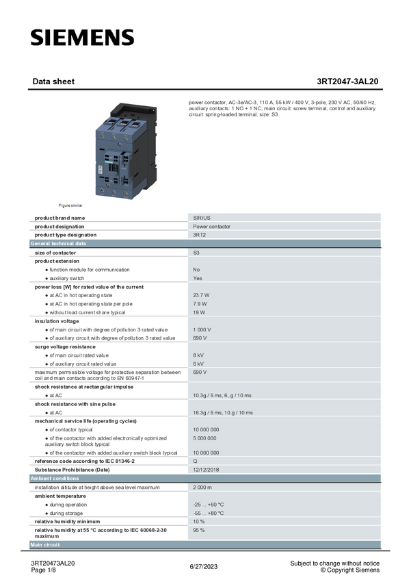 Siemens 3RT2047-3AL20 Stycznik 1 szt.