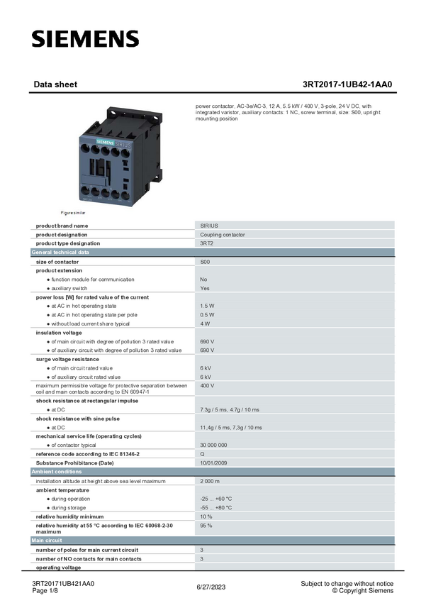 Stycznik Siemens 3RT2017-1UB42-1AA0 3RT20171UB421AA0, 1 szt.
